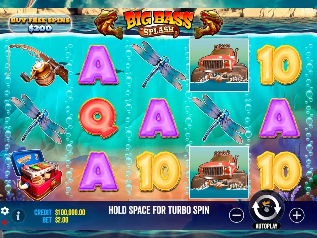 The Big Bass Splash slot features slightly improved visuals over the original, with a Wild West twist, evidenced by the Fisherman Wild wearing a cowboy hat. The setting is a murky underwater canyon. High-paying symbols include a fishing rod, a dragonfly, a tackle box, and, uniquely, a Monster Truck.