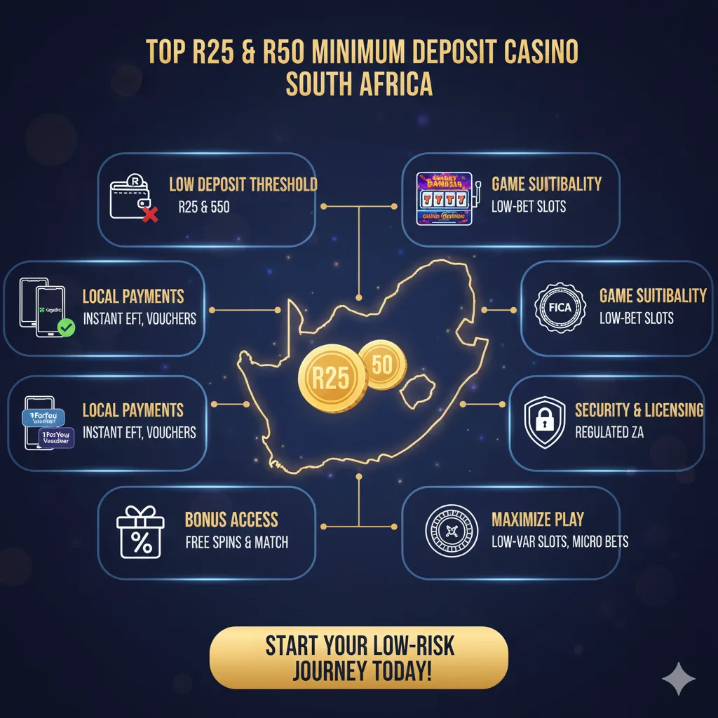 Discover the Top R25 & R50 Minimum Deposit Casino South Africa sites, allowing you to start gambling online with minimal financial risk. Learn key bankroll management strategies, including how to unlock valuable Welcome Bonus offers and Free Spins with low deposits. We highlight platforms that accept localized payment methods like Capitec Pay and offer low-variance slots and micro-betting options to maximize your small Rands budget.